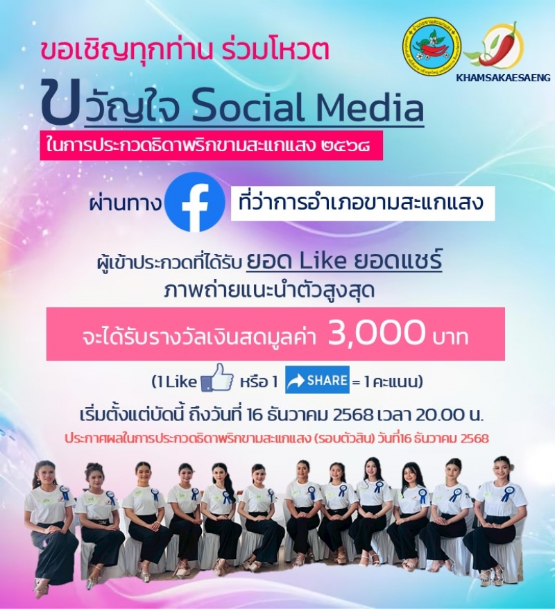 ขอเชิญเที่ยวงานวันพริกและของดีอำเภอขามสะแกแสง ประจำปี 2568 ระหว่างวันที่ 16-20 ธันวาคม 2568