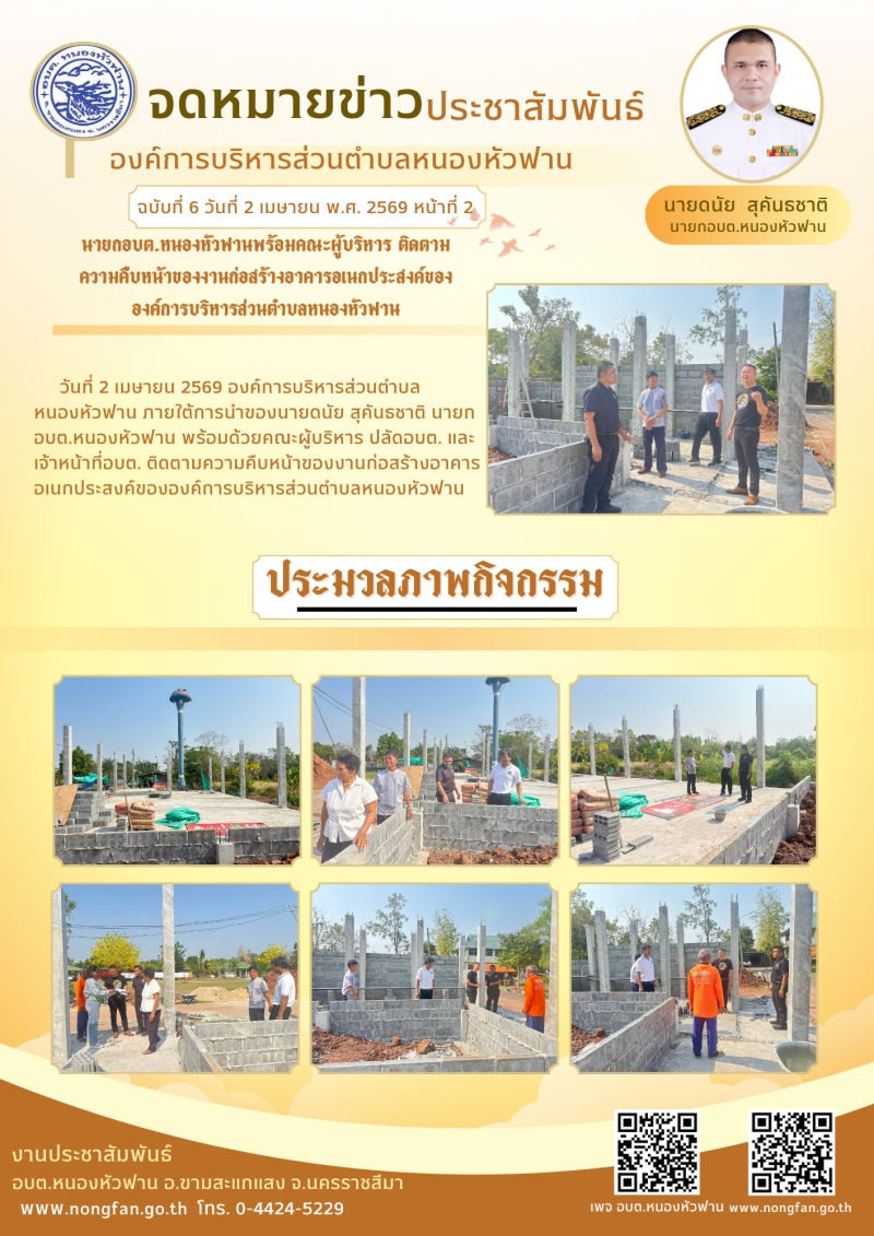 องค์การบริหารส่วนตำบลหนองหัวฟาน ภายใต้การนำของ นายดนัย สุคันธชาติ นายกองค์การบริหารส่วนตำบลหนองหัวฟาน ขอเผยแพร่ ข้อมูล ข่าวสาร กิจกรรม ผลการดำเนินงาน จดหมายข่าวฉบับวันพฤหัสบดีที่ 2 เมษายน 2569