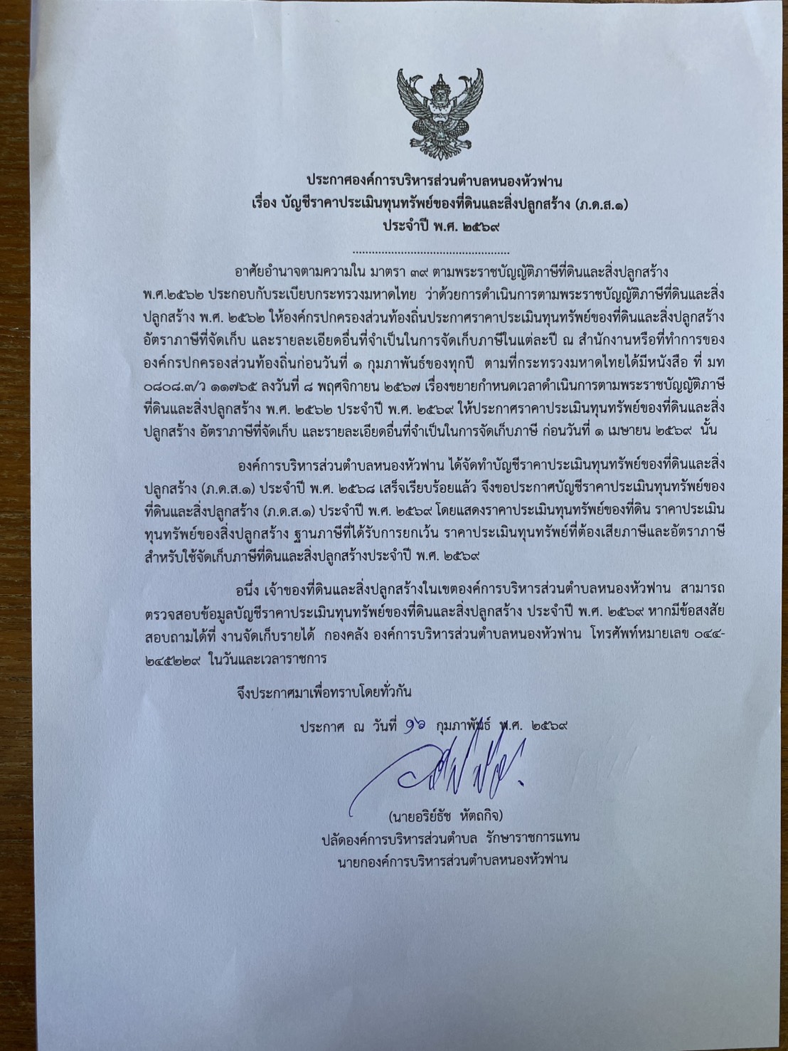 ประกาศองค์การบริหารส่วนตำบลหนองหัวฟาน เรื่อง ประชาสัมพันธ์ ภาษีที่ดินและสิ่งปลูกสร้าง และภาษีป้าย ประจำปี พ.ศ.2569 |